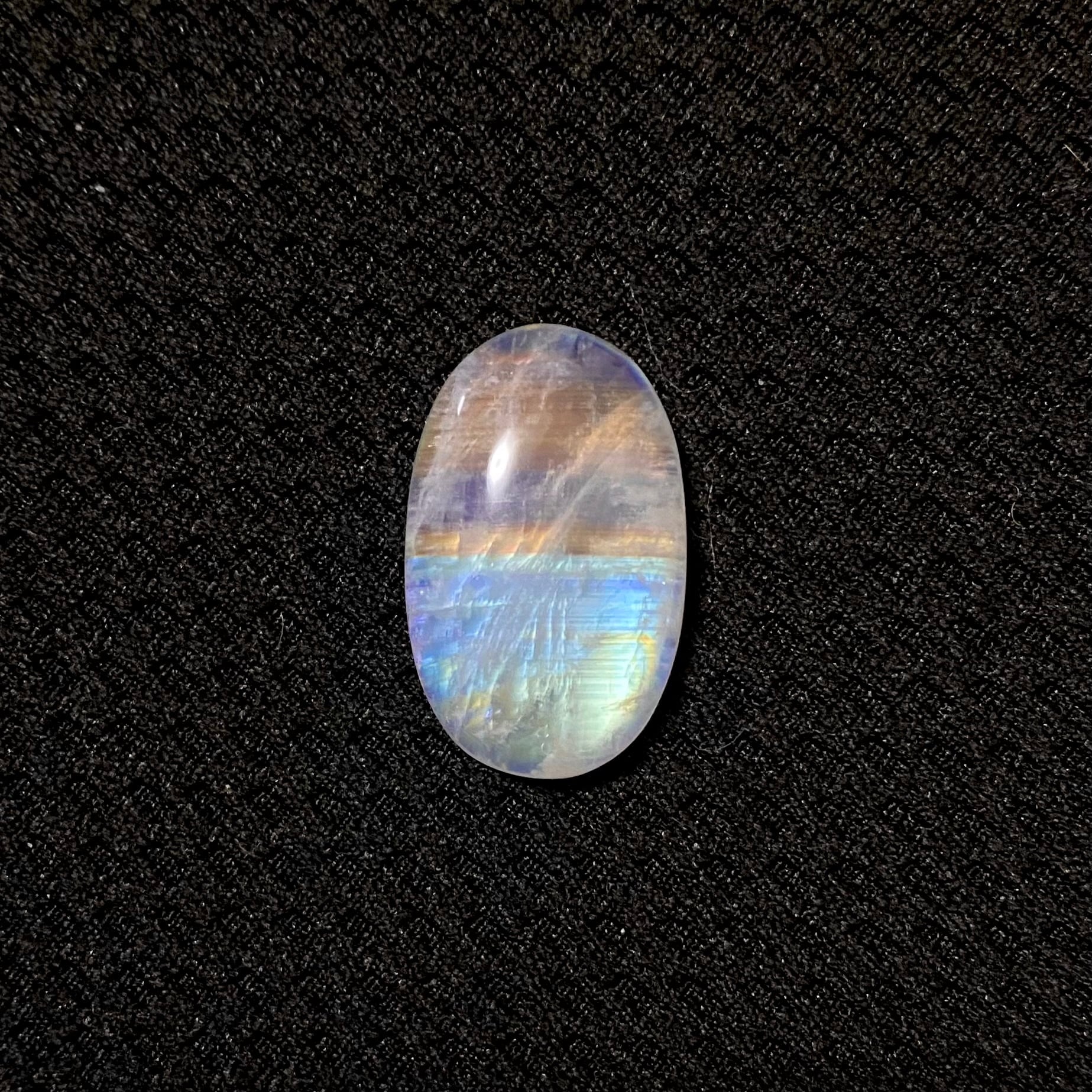 赤系と青系半々でカプセルの様なレインボームーンです。 23×14.3×5.7mm 正面から綺麗に光ります。