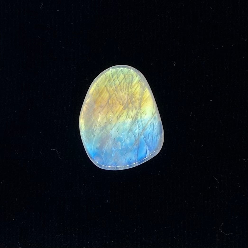 正面から綺麗に光るレインボームーンストーンです。 赤から青まで見えて見事なレインボーです。 21.4×17.0×6.0mm