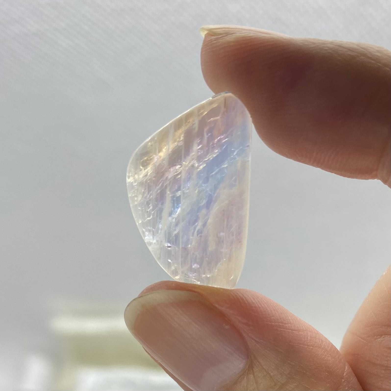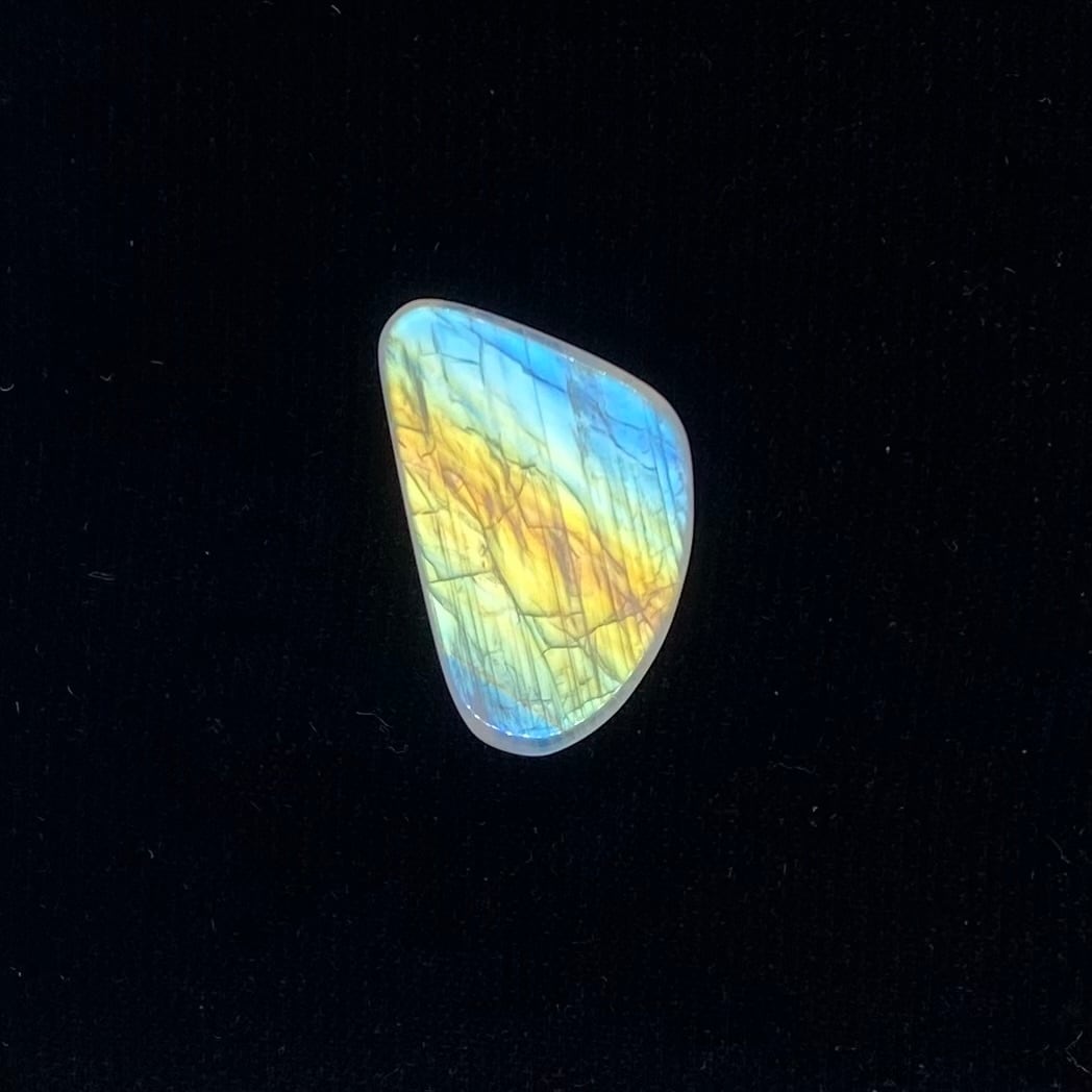 正面から綺麗に光るレインボームーンストーンです。 赤から青まで見えて見事なレインボーです。 22.5×17.3×5.5mm